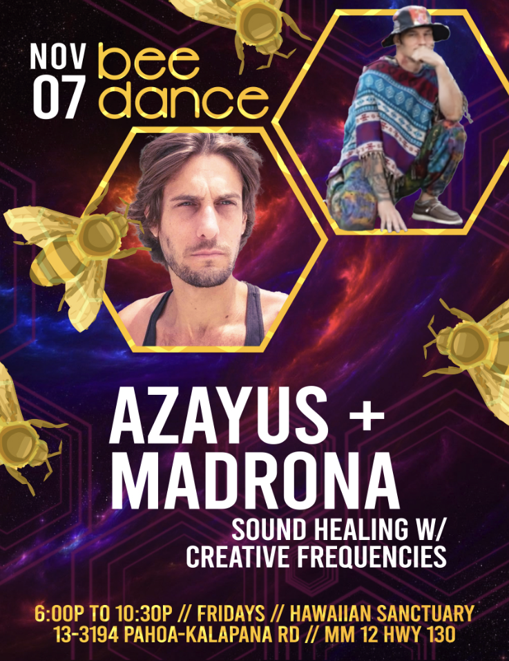 Bee Dance was born out of a desire to offer something uniquely Puna – raw, grounded, and real. It honors the lineage of dance as healing but doesn’t follow the path of ecstatic dance. Instead, we offer something all our own.