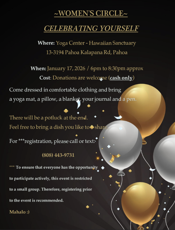 The Women’s Circle takes place in the Yoga Center at Hawaiian Sanctuary in Pahoa, Hawai‘i, surrounded by the beauty of nature and the energy of intentional community. Space is limited to ensure an intimate experience, so registration is encouraged.