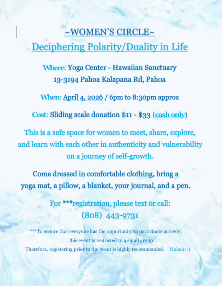The Women’s Circle takes place in the Yoga Center at Hawaiian Sanctuary in Pahoa, Hawai‘i, surrounded by the beauty of nature and the energy of intentional community. Space is limited to ensure an intimate experience, so registration is encouraged.