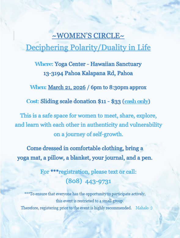 The Women’s Circle takes place in the Yoga Center at Hawaiian Sanctuary in Pahoa, Hawai‘i, surrounded by the beauty of nature and the energy of intentional community. Space is limited to ensure an intimate experience, so registration is encouraged.