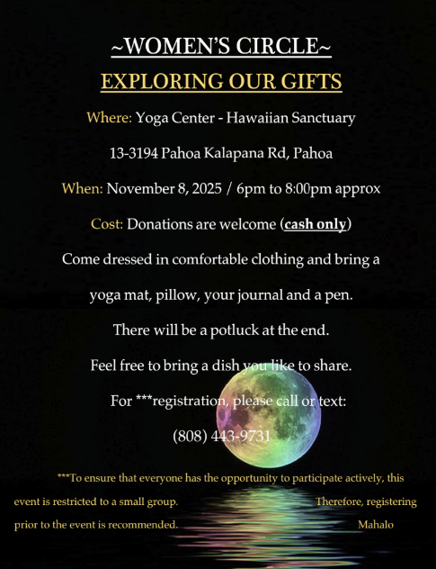 The Women’s Circle takes place in the Yoga Center at Hawaiian Sanctuary in Pahoa, Hawai‘i, surrounded by the beauty of nature and the energy of intentional community. Space is limited to ensure an intimate experience, so registration is encouraged.