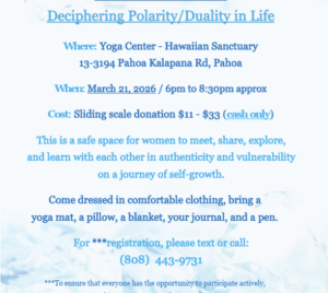 Women’s Circle at Hawaiian Sanctuary Join us for a sacred evening of connection, reflection, and support at the Women’s Circle at Hawaiian Sanctuary. Held during the cycles of the new moon and full moon, this circle provides a nurturing space for women to gather, share, and grow together in community. Our Women’s Circle is an invitation to...